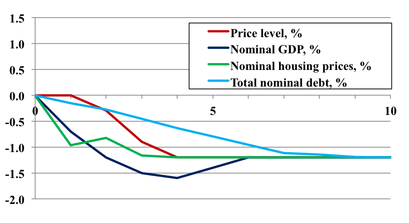 Den tillfälligt lägre inflationen leder till en permanent lägre prisnivå och till permanent lägre nominell BNP och nominella bostadspriser jämfört med basnivån. Lägre nominella bostadspriser medför att nya bolån blir mindre än annars. Men de nya bolånen är bara en liten del av den totala bolånestocken. Här antas denna del vara 14 procent, motsvarande en genomsnittlig lånetid för bolån på 7 år. Eftersom omsättningen av bolånestocken är så begränsad faller den totala nominella skulden långsamt. Prisnivå och nominell BNP faller snabbare, vilket framgår av figur 2, som visar avvikelsen från basnivån i procent för prisnivån, nominell BNP, nominella bostadspriser, och total nominell skuld.