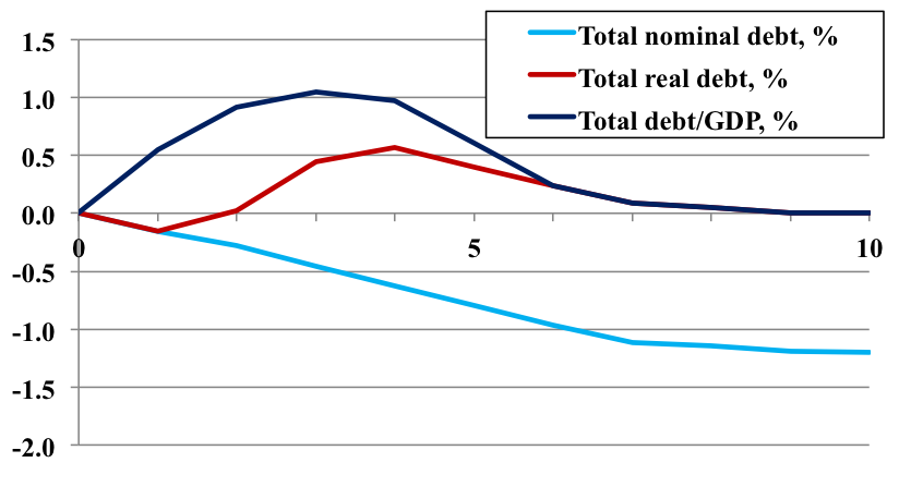 Eftersom den nominella skulden faller så långsamt medan prisnivån och nominell BNP faller snabbare så stiger real skuld när prisnivån faller, och skulden i förhållande till BNP stiger nästan lika mycket och snabbt som nominell BNP faller. Efter några år när prisnivå och nominell BNP stabiliserats vid sin lägre permanenta nivå börjar real skuld och skuld i förhållande till BNP falla tillbaka mot basnivån. Efter 7-8 år är de tillbaka till basnivån och de nivåer de skulle haft i frånvaro av den tillfälliga räntehöjningen. Detta visas i figur 3.