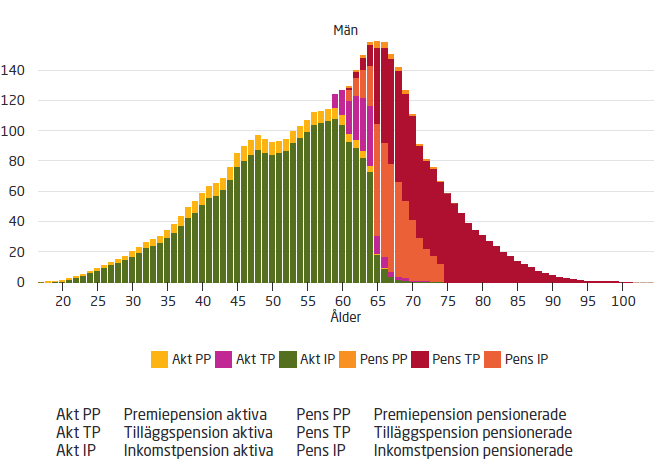 Storleken på de olika pensionskomponenterna (i milj kr) syns i figuren nedan, hämtad från Pensionsmyndighetens Orange Rapport 2012, sid 34. Den gröna stapeln visar rätten till inkomstpension medan den gula visar mängden inbetalda premiepensioner. I genomsnitt är premiepensionerna en tiondel av det totala pensionskapitalet.
