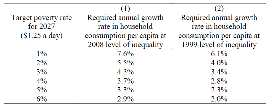 Som tabellen visar skulle en tillväxttakt på 4,5 procent (vilket är i linje med dagens förväntningar) med dagens fördelning göra att endast 3 procent (jämfört med dagens cirka 20 procent) lever i absolut fattigdom år 2030. Om fördelningen ändras till 1999 års nivå skulle en tillväxttakt på 3,4 procent uppnå motsvarande mål. Jämför man olika scenarion kan man notera att även en ganska medioker utveckling resulterar i att andelen absolut fattiga sjunker ganska mycket. I det som kallas ett pessimistiskt scenario i figuren nedan är utvecklingen sådan att cirka en miljard människor lever i absolut fattigdom. Detta är i absoluta tal ungefär lika många som idag och i den bemärkelsen skulle lika många personer leva i absolut fattigdom 2030 som idag. Men som andel av hela befolkningen skulle de vara nere runt 12 procent, alltså nästan en halvering av dagens nivå. Det kan vara lite viktigt det där med hur mål formuleras…