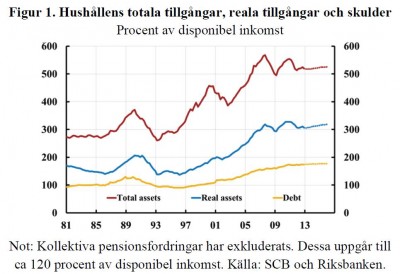 De likvida tillgångarna är ungefär lika stora som skulderna, ungefär 170 procent. Men de reala tillgångarna, på ungefär 300 procent av disponibel inkomst, är ju i princip mer likvida än bolånen, därigenom att man ju får ha kvar bolånet tills man säljer bostaden.