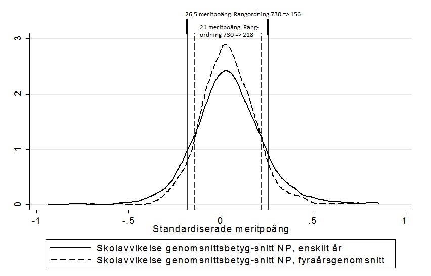 En del av dessa avvikelser beror sannolikt på slumpen snarare än på att vissa skolor är systematiskt generösa eller snåla med betygen. Den streckade linjen visar därför spridningen i de genomsnittliga avvikelserna under fyra år, snarare än under ett enskilt år. Som väntat minskar spridningen men den är fortfarande betydande. Så betydande att en medelskola som går från att vara hyfsat snål i betygsättningen till att vara förhållandevis generös kan klättra 500 platser i betygsrangordningen. Detta betyder att elever som har ungefär samma kunskapsnivå enligt de nationella proven kan få mycket olika slutbetyg beroende på vilken skola de går på.