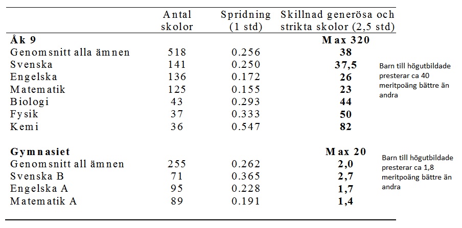 Mittenkolumnen visar hur stor spridningen (en standardavvikelse) i avvikelsen mellan internt och externt rättade prov är på skolnivå uttryckt i standardiserade provresultat. Kolumnen till höger uttrycker i meritpoäng vad denna spridning motsvarar om man skulle skriva sina prov på en skola som rättar proven relativt strikt jämfört med en som rättar proven generöst. Skillnaden är betydande och storleksordningen kan jämföras med den genomsnittliga betygsskillnaden mellan elever med och utan högutbildade föräldrar. Riktigt så stora är dock inte skillnaderna i praktiken eftersom en skola inte är lika generös vid bedömningen av alla prov.