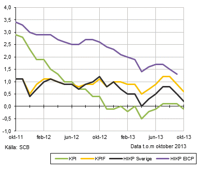 • Konsumentsprisindex (KPI) mäter levnadskostnaderna (kostnaden för en genomsnittlig konsumtionskorg) i kronor. Eftersom KPI nu är på ungefär samma nivå som i november 2011 har således levnadsomskostnaderna mätt i kronor inte stigit på två år. Sedan 1995 har KPI ökat med i genomsnitt 1,4 procent år. Det borde ha ökat med 2 procent per år, eftersom inflationsmålet är 2 procent.