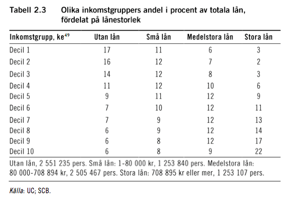 Statistiken visar sammantaget att personer med högre utbildning, högre inkomster, medelålders, män, boende i Stockholm och barnfamiljer har lån i högre utsträckning än andra. Detta är i regel grupper som bör ha det lättare att hantera stora lån jämfört med andra eftersom de i regel har större förmögenheter, bättre arbetsmarknadsutsikter och lägre förekomst av sjukskrivning än övriga grupper.