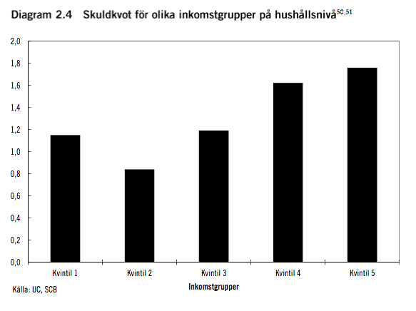 Kvintil 1, den femtedel av befolkningen med lägst inkomster, utgör ett undantag. En anledning till att denna grupp utmärker sig är att gruppen med negativa inkomster, till exempel på grund av kapitalförluster eller negativ näringsinkomster, har relativt stora skulder. Om man exkluderar dessa blir skuldkvoten något lägre för kvintil 1.