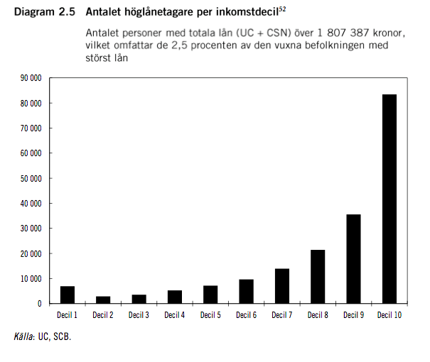 En annan indikator, som utredningen håller fram, är fördelningen av höglånetagarna, personerna med de största lånen, över inkomstdecilerna. Bara en fjärdedel av alla med lån har lån över 708 895 kronor. Ju högre lån, desto mera koncentrerade till dem med höga inkomster är de: