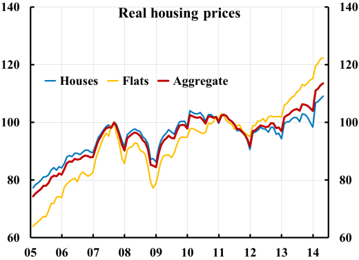 Uppdaterat 2014-06-15 med senaste tillgängliga data: April för bostadspriserna och kvartal 1 för disponibel inkomst. Uppdaterat 2014-07-29 med en figur med nominella bostadspriser och nominell disponibel inkomstredovisade separat.