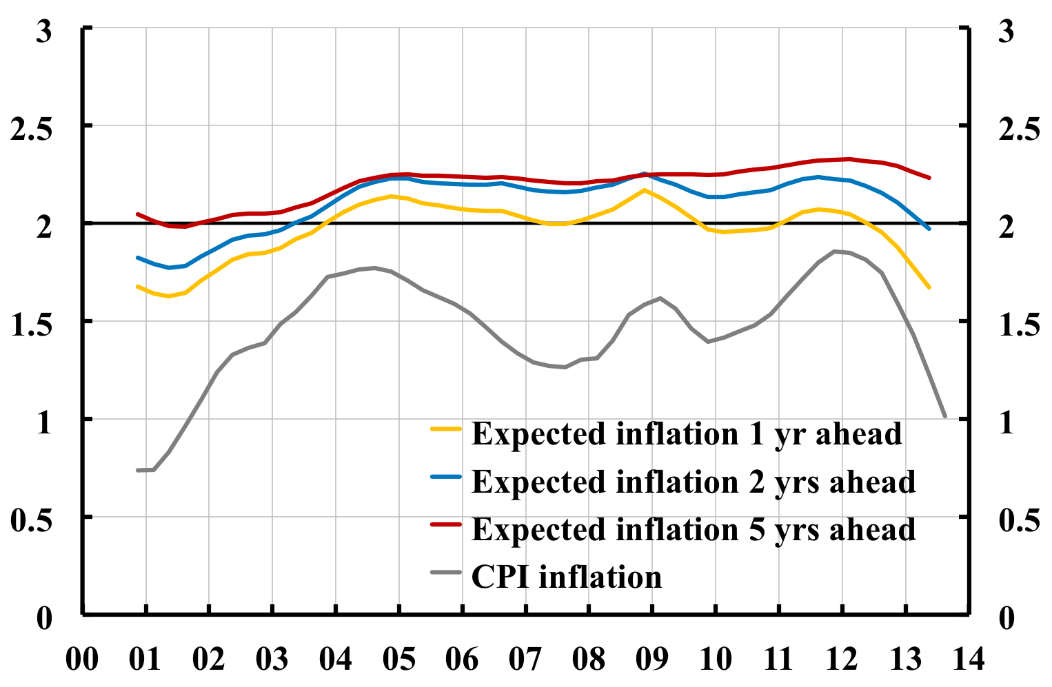 Vi ser också i figur 1 att den faktiska inflationen varit nära 0 procent eller lägre sedan hösten2012. Det betyder att prisnivån i april 2014 är ungefär densamma som för två och ett halvt år sedan.