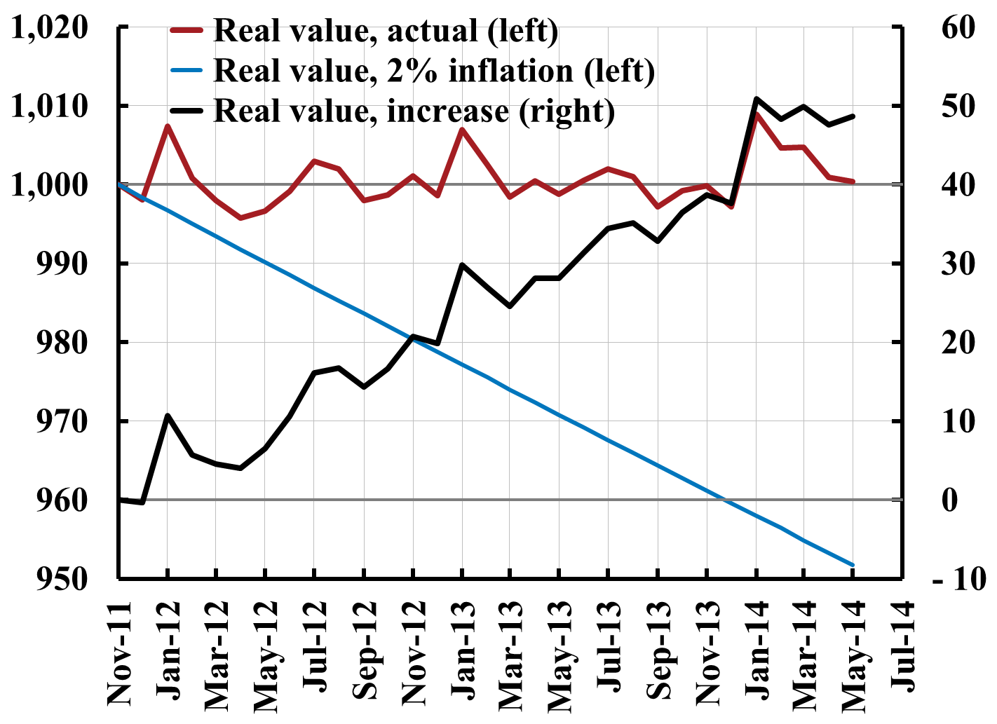 Denna nya figur, figur 3, visar utvecklingen över tiden av det reala värdet av ett lån på 1 miljon kronor som togs i november 2011 (röd kurva, vänster axel, tusental kronor). Det har fluktuerat upp och ner något, men i maj 2014 ligger det på precis samma nivå, 1 miljon kronor, som i november 2011. Figuren visar också hur utvecklingen av det reala värdet hade blivit om inflationen hade varit 2 procent (blå linje, vänster axel). Då hade det reala värdet fallit med 2 procent per år och i maj 2014 varit ungefär 950 000 kr. Detta är den automatiska reala amortering av lånet som en inflation på målet medför. Figuren visar slutligen (svart kurva, höger axel, tusental kronor) utvecklingen av ökningen i det faktiska reala värdet jämfört med det reala värdet om inflation hade varit 2 procent, dvs. skillnaden mellan röd kurva och blå linje. Skillnaden växer från 0 kr i november 2011 till 50 000 kr i maj 2014. För varje lånad miljon har således låntagarna under de senaste två och ett halvt åren förlorat 50 000 kr, jämfört med om inflationen hade varit 2 procent. Det är en ansenlig kapitalförlust, särskilt på så kort tid.