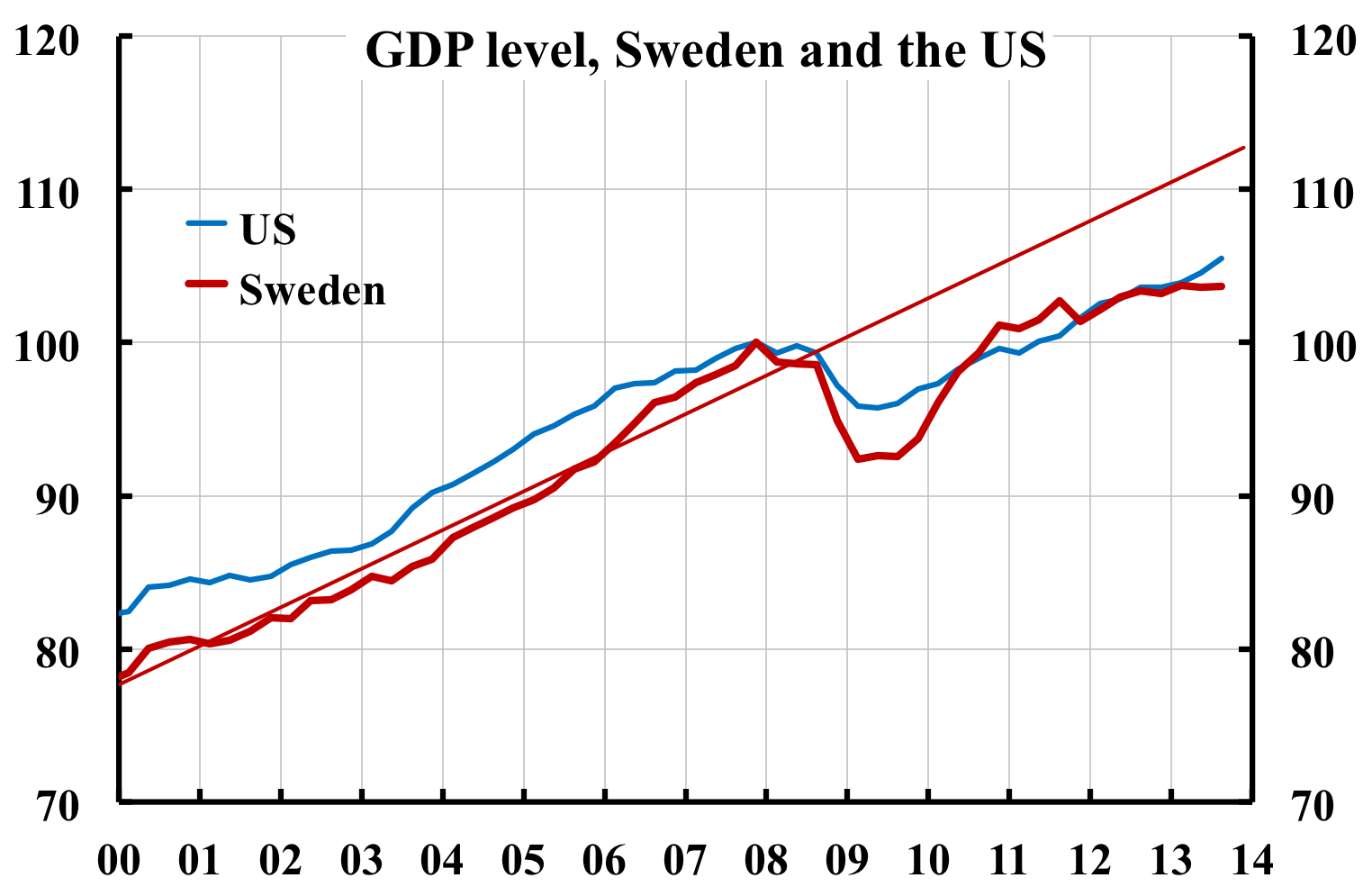 Argumentet att ekonomin hade återhämtat sig är svårt att hävda, eftersom arbetslösheten var skyhög, närmare 9 procent, långt över nivån före krisen. Och som vi ser i figur 3 var BNP-nivån fortfarande under nivån före krisen. Den höga tillväxten skedde dessutom från den mycket låga nivå BNP hade fallit till i början på 2009. Vi ser också att BNP-nivån, jämfört med nivån före krisen, bara hade återhämtat sig till samma nivå som i USA, efter att ha fallit djupare i Sverige än i USA. BNP-nivån låg (och ligger) fortfarande mycket långt under en linjär trend för 1993-2007 (den låg och ligger ännu längre från en exponentiell, dvs. loglinjär, trend).