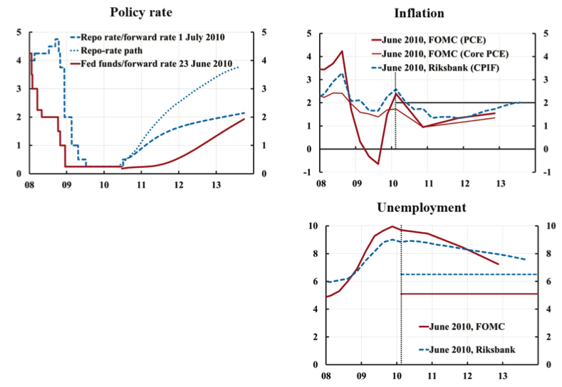 Figur 2. Styrränta och prognoser för inflation och arbetslöshet av Riksbanken och Federal Reserve, juni 2010.