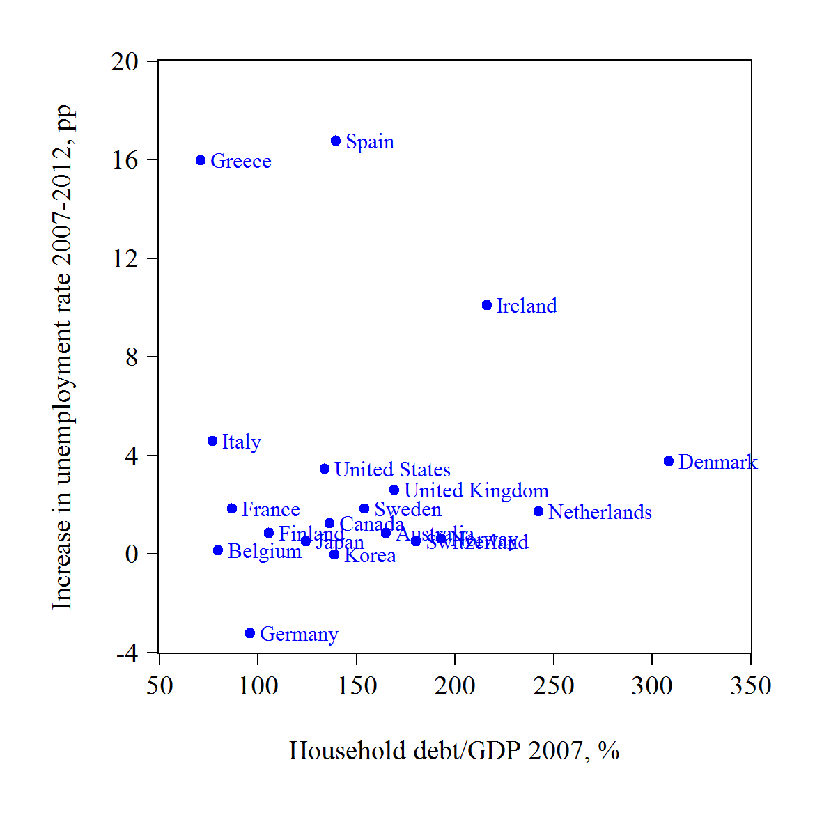 Figur 2 visar att det inte heller verkar finnas något samband mellan skulderna och uppgången i arbetslöshet 2007-2012 för dessa länder. Detta stämmer också med analysen i kapitel 4 i ovannämnda IMF World Economic Outlook, där det är en stor skuldökning i förhållande till disponibel inkomst de tre åren närmast före en nedgång (”bust”), inte nivån på skuldkvoten i förhållande till disponibel inkomst, som har ett förklaringsvärde.
