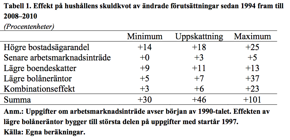 Till detta kan läggas att Riksbankens ekonometriska VAR-modell inte är korrekt specificerad. För det första, för att precisera den empiriska effekten av styrräntan på skulderna, måste man kontrollera för övriga faktorer som påverkar skuldsättningen. Som framgår av tabell 1 nedan från Sten Hansens utmärkta PM 1 till Stabilitetsrådet (sid. 2) är de främsta faktorerna bakom förändringen av skuldkvoten en högre bostadsägarandel och lägre bolåneskatter. Tillsammans kan dessa haft fyra gånger större effekt än bolåneräntorna (enligt kolumnen ”Uppskattning” i tabellen). Dessutom tillkommer, enligt Hansens PM, ytterligare faktorer, vid sidan om en stigande ägarandel, som påverkar den aggregerade skuldkvoten (sid.7): ”För det första har det skett en snabb urbanisering vilket gör att många av de nyproducerade bostäderna finns i storstadsområden där bostäderna i allmänhet är dyrare än genomsnittet för riket. För det andra har många hyresrätter ombildats till bostadsrätter, också det främst i storstadsområden där bostäderna är dyrare än genomsnittet. För det tredje är nytt bostadsägande intimt förknippat med hög skuldsättning inledningsvis, vilket i och för sig talar för en viss återhållande effekt på utvecklingstakten för den aggregerade skuldkvoten framöver.” Om man inte kontrollerar för dessa effekter, och motsvarande variabler inte finns med i VAR-analysen, så blir de effekter som tillskrivs styrräntan missvisande.