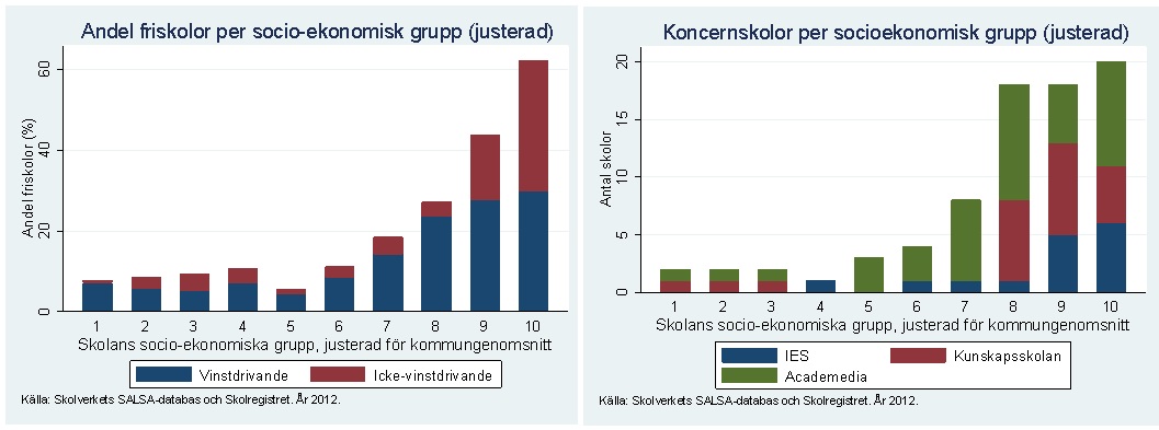 SES-friskolorI den högsta socio-ekonomiska gruppen är hela 55 procent av skolorna fristående, vilket kan ställas med fem procent i den lägsta. Detta mönster är särskilt uttalat bland icke-vinsdrivande friskolor men även de vinstdrivande skolorna är koncentrerade bland elevgrupperna med mest gynnsamma förutsättningar. Enligt figuren nedan gäller detta även om man undersöker de tre stora skolkoncernerna Academedia, Internationella Engelska Skolan och Kunskapsskolan.