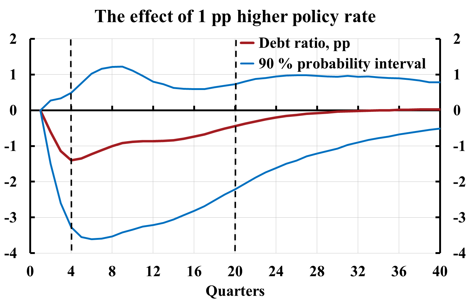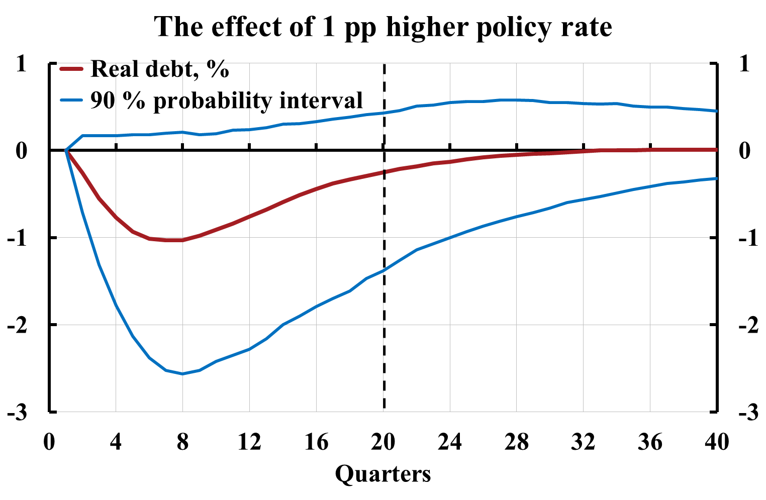 Vad blir effekten av en högre styrränta på konsekvenserna av en kris? Enligt Riksbanken (2014b, diagram A22) skulle 1 procentenhet högre styrränta under 4 kvartal leda till 1,4 procentenheter lägre skuldkvot inom 1 år och 0,44 procentenheter lägre skuldkvot inom 5 år (se den röda kurvan i figur 3 för 4 respektive 20 kvartal).[5]