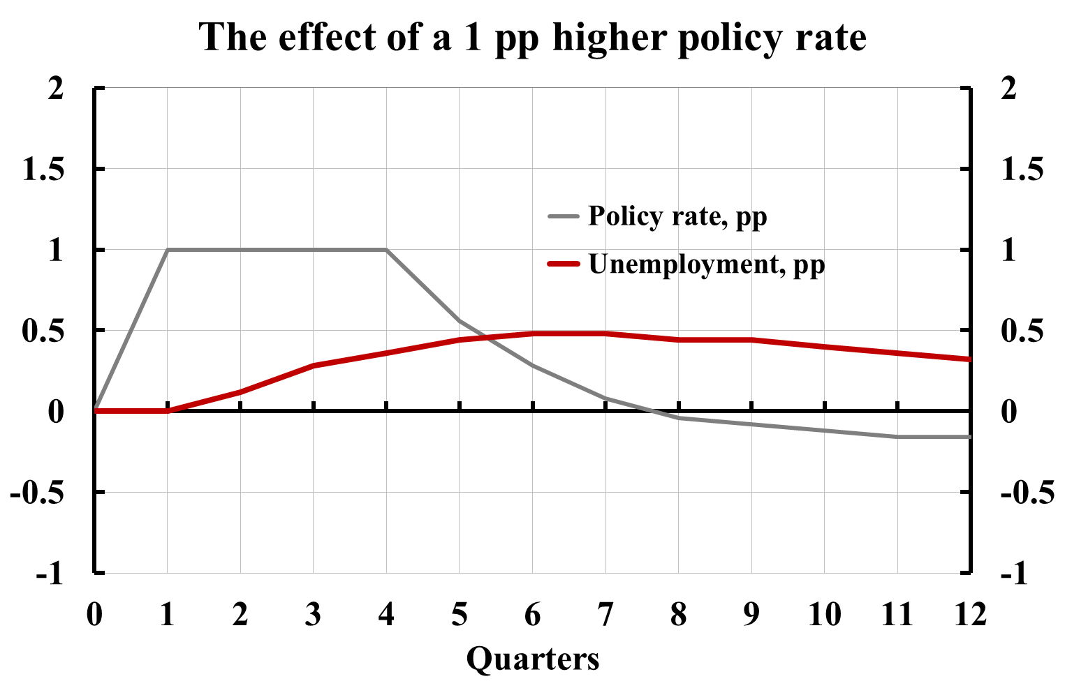 Figur 1. Effekten på arbetslösheten av 1 procentenhet högre styrränta i fyra kvartal. Källa: Riksbanken.