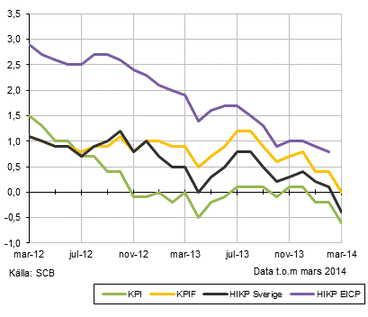Sverige har deflation, dvs. negativ inflation. Enligt SCB var KPI-inflationen i mars minus 0,6 procent. Som vi ser i figuren nedan har KPI-inflationen legat runt noll sedan november 2012  och varit negativ sedan januari 2014. Inflationen mätt med KPIF respektive HIKP var i mars 0 procent respektive -0.4 procent. Vi ser att KPIF- och HIKP-inflationen har haft en nedåtgående trend sedan sommaren 2013. Inflationstakten i Sverige är nu bland de lägsta i världen. Vad beror deflationen på, vad får den för konsekvenser, kan Sverige hamna i en liknande situation som Japan och vad kan man göra åt problemet?