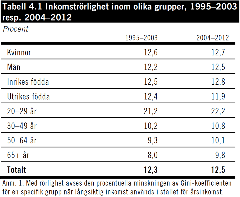 En annan jämförande analys av de två tidsperioderna visas i tabell 4.1, där olika inkomsttagarkategorier jämförs. Skillnaderna i inkomströrlighet mellan könen är mycket små, unga vuxna uppvisar högst rörlighet medan äldre rör sig minst. Återigen förefaller skillnaderna mellan tidsperioderna vara mycket små, men om något så verkar rörligheten ha ökat något på senare tid.