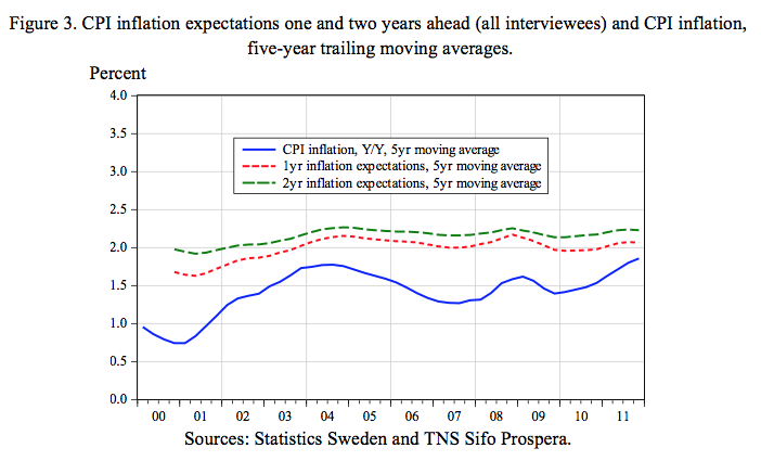 I Sverige annonserade Riksbanken i januari 1993 att ett inflationsmål på 2 procent för KPI skulle börja gälla från 1995. Inflationsförväntningarna var till en början mycket höga (figur 2 i uppsatsen, ej återgiven här), men från slutet av 1996 hade de förankrats tämligen väl vid inflationsmålet. Faktisk inflation blev dock betydligt lägre, som visas av figur 3 nedan (från uppsatsen, med KPI-inflation samt inflationsförväntningar enligt Prospera, glidande femårsmedeltal).