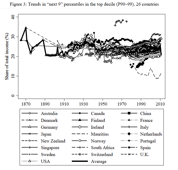 För det andra så utgörs en stor del av den långsiktiga förändringen av topp-decilens (P90-100) inkomstandel sett över alla länder av förändringar som sker i topp-percentilens (P99-100) andel. Över en 100 års period har inkomstandelen för höginkomsttagaren som befinner sig under den översta procenten (P90-99) varit relativt konstant i förhållande till hur mycket topp 1 har fluktuerat.