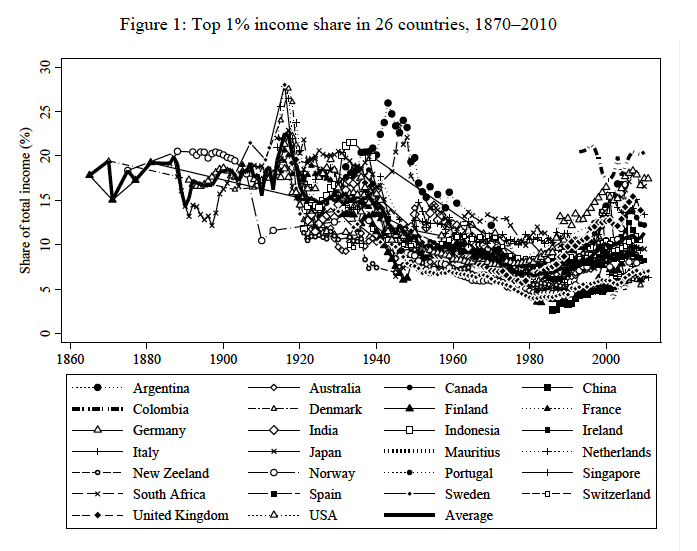 Huvuddragen i den bild som framträder kan sammanfattas i två figurer (se kapitlet för mer detaljer). Den första visar ett gytter av olika länders utveckling men där några gemensamma drag framträder. För det första tycks inkomstkoncentrationen ha varit historiskt hög i början av 1900-talet i nästan alla länder för vilka vi har data. Hur utvecklingen ser ut dessförinnan är mer oklart. I vissa länder finns det tecken på att inkomstkoncentrationen var lägre i början av 1800-talet och att den sedan ökade i samband med industrialiseringen men i de flesta fall tycks nivån varit relativt hög även bakåt i tiden. Från 1900-talets början till runt 1980 minskar inkomstkoncentrationen och topp-procentandelen mer än halveras i de flesta länder. Denna utveckling drivs till stor del av lägre kapitalinkomster. Efter 1980 är utvecklingen mer spridd. I vissa länder har inkomstandelen i den yttersta toppen ökat kraftigt, i vissa fall (som i USA) nästan till samma nivåer som innan första världskriget. I andra länder har uppgången varit mycket mindre och i vissa fall nästan obefintlig. Ser man till inkomstkompositionen i denna utveckling finns fler skillnader; i vissa länder (som i Sverige) drivs mycket av förändringar i kapitalinkomster medan större lönespridning är viktigare i andra fall (som i USA); se tidigare inlägg här, här och här. Mycket översiktligt ser utvecklingen för topp 1 procent ut som i följande bild (den som vill urskilja enskilda länder får titta i artikeln eller i tidigare inlägg här):