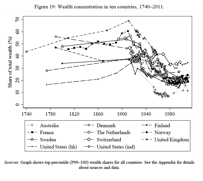 Det tredje avsnittet handlar explicit om förmögenhetsfördelningen över tid. Här är data mycket mer knapphändig och jämförelser mellan länder också mycket svårare. Även här framträder en bild där utvecklingen före 1914 är oklar (men där det mesta pekar på en relativt hög koncentration bakåt i tiden), utvecklingen under 1900-talet fram till runt 1980 otvetydigt är sådan att koncentrationen i toppen miskar, och där det i vissa fall finns tecken på en ökad koncentration de senaste årtiondena (dock mycket mindre tydligt än för inkomster, dock är denna fördelning mycket svårare att studera). Vi diskuterar vilka olika metoder som använts och redovisar resultaten för tio länder. Resultatet i en bild över perioden 17400-2010 ser ut så här: