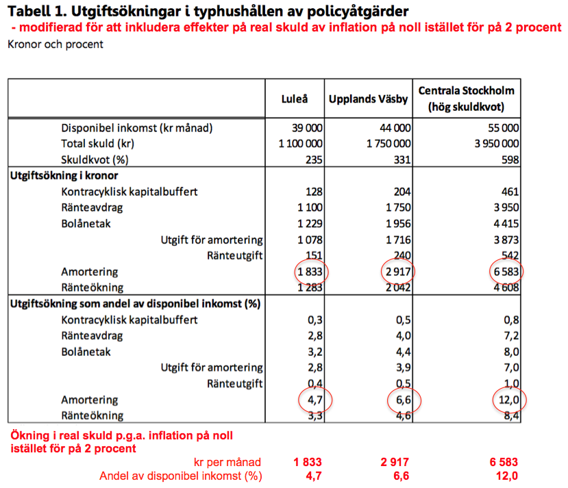Resultaten av Ingves beräkningar sammanfattas i tabell 1 i slutet av talet. Den visas nedan. Jag har markerat den månatliga utgiftsökningen i kronor respektive som andel i procent av disponibel inkomst på grund av ett amorteringskrav med röda cirklar för de tre typhushållen. Dessutom har jag med röd text kompletterat tabellen med den ökning av den reala skulden som uppstår av en inflation på noll istället för på 2 procent. tal_ingves_140528_sve-tabell-1-modifierad Först har alltså Riksbanken bedrivit en penningpolitik som medför att den reala skulden de senaste åren blivit 2 procent större per år än den skulle blivit med den automatiska amorteringen med 2 procents inflation. Sedan föreslår Ingves ett amorteringskrav som som medför en minskning av skulden med 2 procent per år. Nettoresultatet med Ingves amorteringskrav blir att reala skulder skulle minska med 2 procent per år, som om Riksbanken hade uppfyllt inflationsmålet.