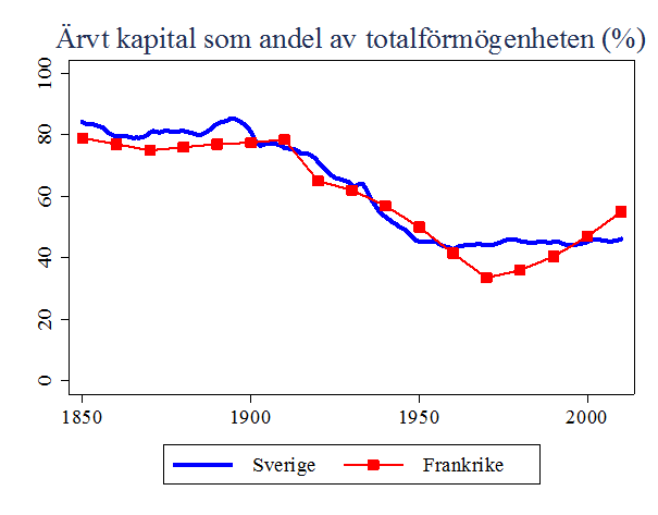 Vår uppsats innehåller även en uppskattning av hur stor andel av den privata förmögenheten vid en given tidpunkt som består av ärvt kapital, och hur stor andel som är egenhändigt intjänad, och hur dessa andelar utvecklats över tid. Frågan rönte stor uppmärksamhet i USA på 1980-talet då nationalekonomerna Laurence Kotlikoff och Franco Modigliani debatterade detta. Idag vet vi tack vare Piketty att de båda inte riktigt träffade helt rätt, och andelen ärvt kapital i den totala förmögenhetsstocken kan beräknas mer precist. Bilden nedan visar andelen i Sverige och Frankrike sedan 1850. Återigen ser vi en hög nivå i båda länderna under 1800-talet då ca 80 procent av alla förmögenheter var ärvda. Andelen sjunker till runt hälften fram till 1950, och därefter har den ökat i Frankrike med varit stabil i Sverige. Orsaken till denna diskrepans är inte klarlagd.