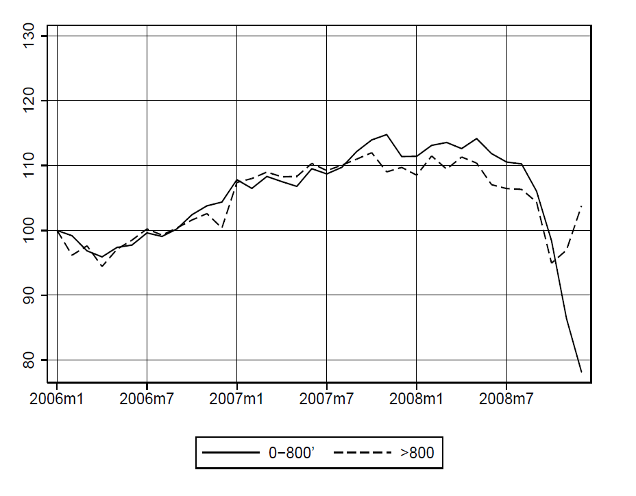 Men enligt figuren drar ju fastighetspriserna på dyrare hus iväg i slutet av 2008. Kan det inte bara ha varit så att det tog lite tid för folk att ta in detta i beräkning???