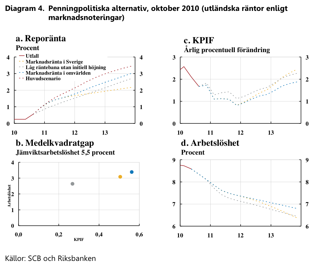 Vid mötet i oktober 2010 hade jag också upptäckt att Riksbankens prognoser för utländska räntor låg orimligt högt i förhållande till både marknadsförväntningar och uttalanden av centralbankerna om sina framtida räntor. En nedjustering av denna prognos skulle ha lett till en prognos med en starkare krona, ännu lägre inflation och ännu högre arbetslöshet. Detta tog jag hänsyn till vid presentationen av alternativa räntebanor och prognoser vid mötet. Den räntebana Karolina och jag reserverade oss för vid detta tillfälle låg betydligt lägre än huvudscenariots och slutade på 2,7 procent vid prognosperiodens slut (gråprickig, Låg räntebana utan initiell höjning, i nedanstående diagram från protokollet). Men även denna låga räntebana medförde en inflationsprognos som låg alldeles för lågt, och en ännu lägre räntebana skulle ha krävts vid nästa möte.