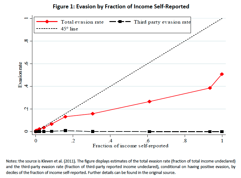 Den tydligaste illustrationen av den första punkten kommer ifrån en artikel av Henrik Kleven och ett antal medförfattare publicerad i Econometrica för några år sedan. Titeln på artikeln – Unwilling or unable to cheat? – illustrerar vad de försöker studera: är de så att danska skattebetalare inte undanhåller skatt för att de av någon anledning har speciellt hög skattemoral eller är det snarare så att systemets utformning gör det svårt att undanhålla skatt?