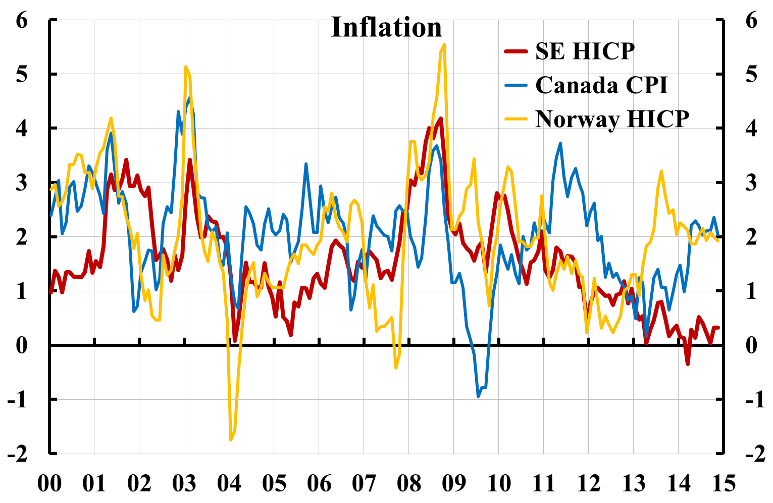 Figur 4. Inflationen mätt med HIKP i Sverige och Norge och mätt med KPI i Kanada. Källa: Datastream.