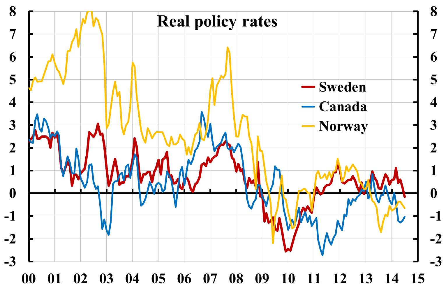 Eftersom inflationen och en rimlig inflationsprognos är lägre för Sverige än för de andra ekonomierna i figurerna (utom möjligtvis för euroområdet), och arbetslösheten och en rimlig arbetslöshetsprognos är högre än i andra jämförbara länder, borde den reala styrräntan vara lägre i Sverige än i de andra ekonomierna. Men den är alltså högre än den reala styrräntan i Kanada, Norge, och USA, trots högre inflation och lägre arbetslöshet i dessa länder. Efter att den reala styrräntan i Sverige tidigare har varit betydligt högre än den i euroområdet och Storbritannien är den nu på samma nivå som där (trots att arbetslösheten i Storbritannien faller och är betydligt lägre än i Sverige). I jämförelse med dessa ekonomier är således Riksbankens penningpolitik inte alls expansiv.