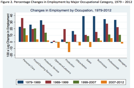 Motsvarande utveckling syns tydligt i USA under perioden 1979-2012. Till höger i figuren nedan (tagen från en mycket läsvärd översikt av David Autor som skrivit mycket på detta område) visas jobbtillväxtens utveckling för yrken med relativt höga löner och där många är högutbildade, i diagrammets mitt finns fyra yrkesgrupper som traditionellt varit medelinkomstyrken, medan de tre längst till höger är traditionella låglönebranscher. Sett över hela perioden har arbetsmarknaden tydligt polariserats.