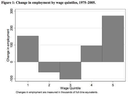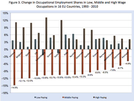 Figuren nedan är baserad på en nyligen publicerad artikel i AER av Maarten Goos, Alan Manning, och Anna Salomons (WP version här). Den illustrerar förändringen i arbetade timmar inom låg-, medel-, respektive höglöneyrken i 16 EU-länder under perioden 1993-2010. Mönstret är slående. Överallt har andelen jobb som i början av perioden kännetecknades av att vara medelinkomstjobb minskat relativt både låglönejobb och höglönejobb.