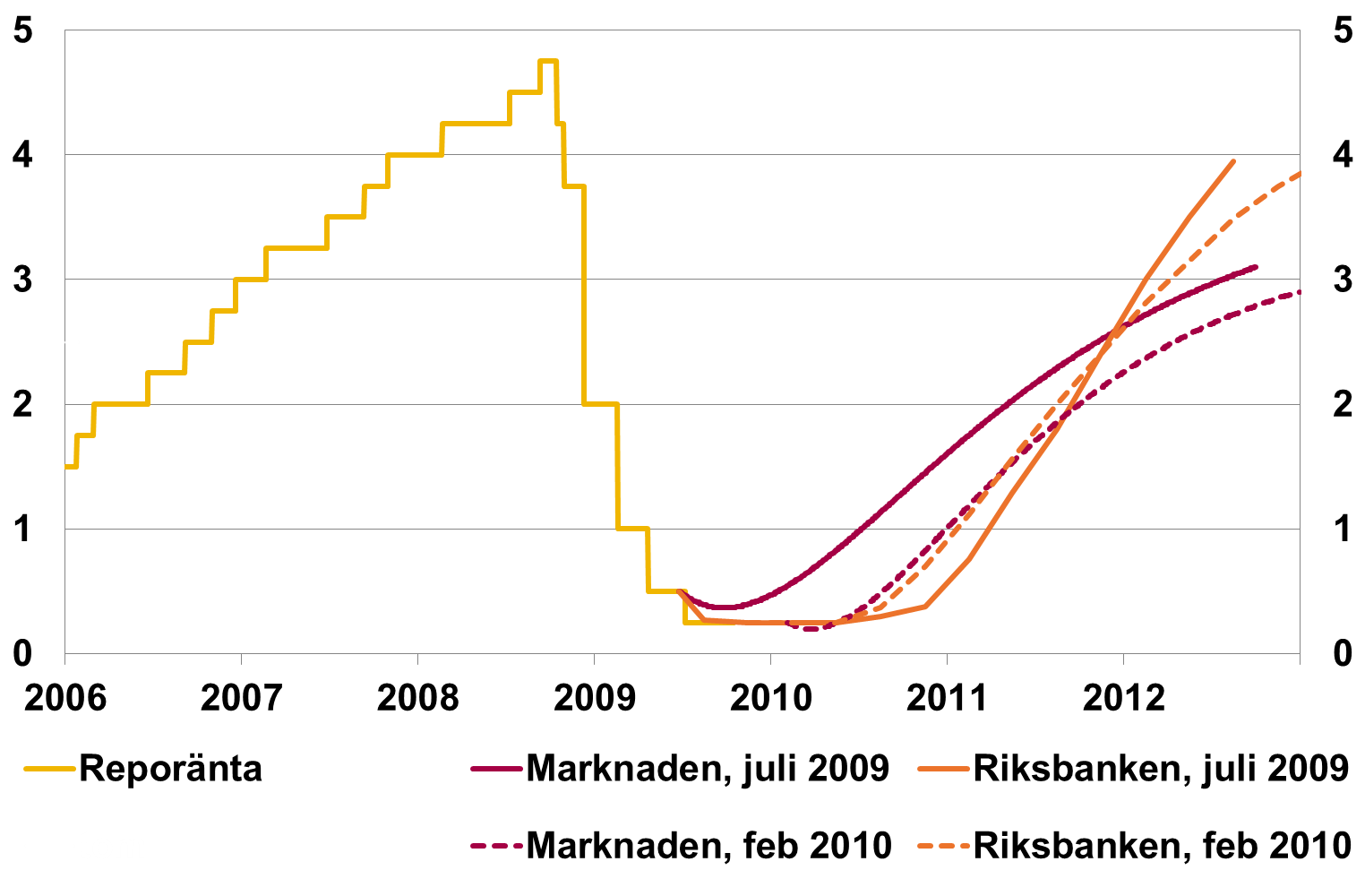 Diagram 1. Reporänta, marknadens förväntningar och Riksbankens räntebanor under 2009-2010.