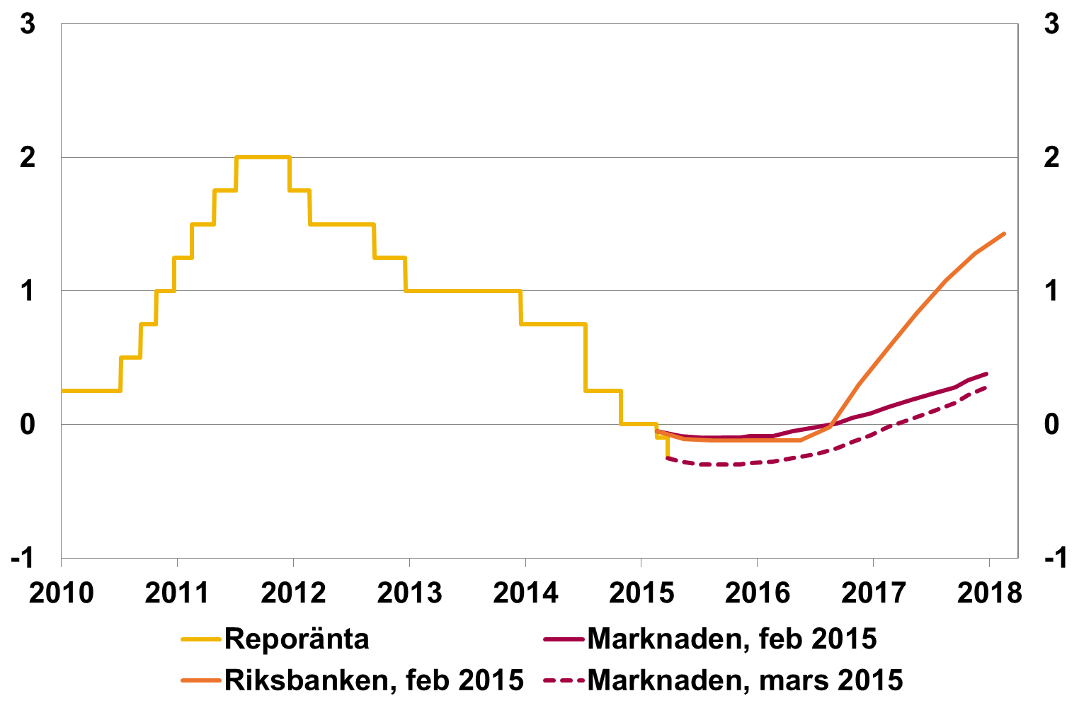 Källor: ”Market pricing of the Riksbank”, 2015-02-12 och 2015-03-30, SEB och ”Penningpolitisk rapport, februari 2015”, Sveriges riksbank. Anm.: Marknadens förväntningar är mätta med terminsräntekurvorna den 12 februari och 30 mars 2015.
