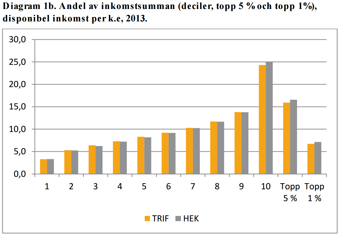 Sammantaget är dock min bedömning att SCBs nya registerbaserade inkomstfördelningsstatistik håller hög kvalitet och kommer att fungera väl även vid längre tidsjämförelser. Värdet att hela befolkningen nu ingår är också betydande eftersom det möjliggör bredare analyser av olika utfall där vi nu har ett hushållsbegrepp som fungerar vid välfärdsanalyser. Naturligtvis kvarstår dock en hel del arbete att kontrollera kvaliteten i TRIF och övergången från HEK, så fortsättning lär följa.