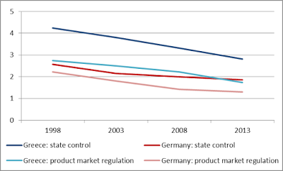 Grekland har enligt OECD fler produktmarknadsrestriktioner och mer statlig kontroll över ekonomin än andra EU-länder. Stora förändringar har dock skett under de senaste åren och Grekland befinner sig nu där Tyskland befann sig för inte alltför länge sedan (se figur 2). Ytterligare reformer för att stärka konkurrensen är en del av de pågående förhandlingarna, men dessa kan visa sig bli kortlivade om de inte kompletteras med reformer av rättsväsendet och byråkratin.