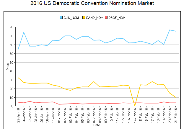 Den demokratiska nomineringskampanjen är förhållandevis jämn enligt opinionsmätningarna som sammanställs av Huffington Post. Men enligt prognosmarknaden IEM är det istället nästan avgjort, med Clinton-aktien på nära 90 procents vinstchans mot Sanders på 10 procent.