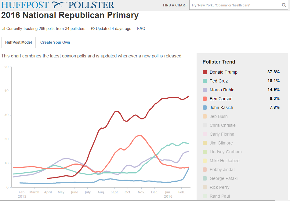 Naturligtvis är denna jämförelse inte helt perfekt eftersom de båda källorna inte mäter precis samma sak. Opinionen är förmodligen relativt nära den som Huffington Post återger, med Trump åtnjutandes en ganska stor andel av de republikanska väljarnas stöd eller Saunders liggandes hack i häl till Clinton.