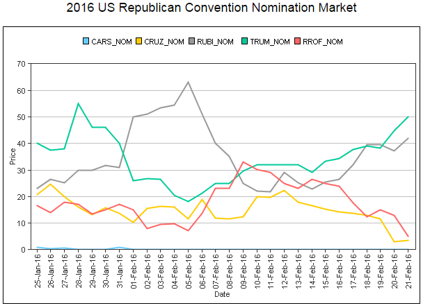 7. 24 fe-2016: Efter Trumps seger i Nevada har hans ”vinnaraktie” rusat från 40% för fyra dagar sedan till nästan 70%. Ett exempel på hur ny information påverkar marknadens prisbildning.