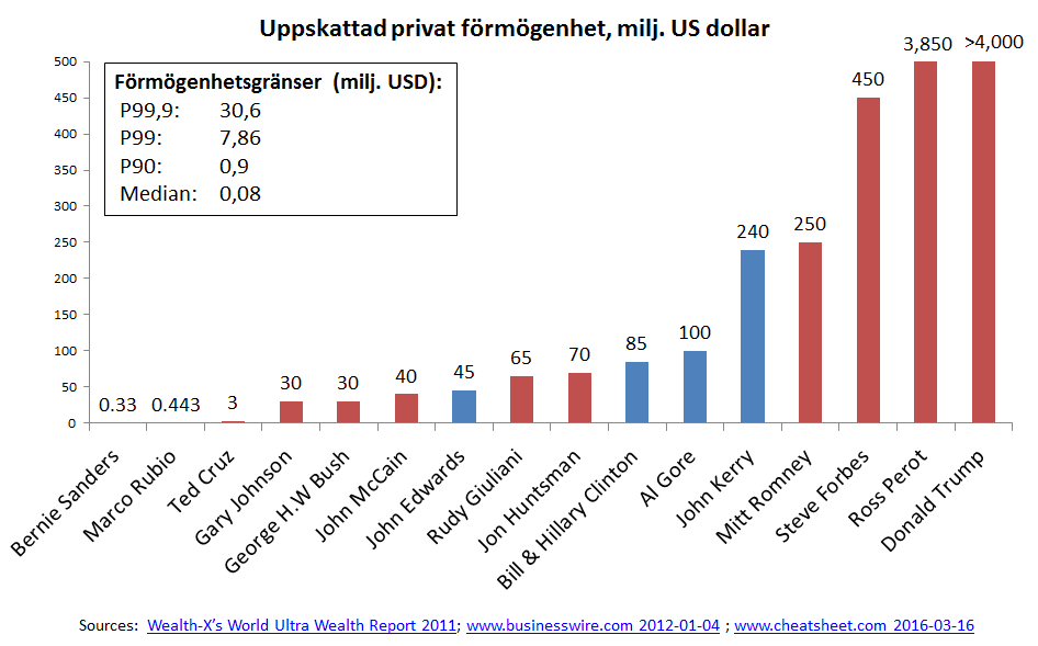 För det första är amerikanska presidentkandidater typiskt sett stormrika. Statistik över förmögenheter i hela USAs befolkning (från Federal Reserv Boards enkätundersökning SCF, se gränsvärden för 2013 här) visar att det krävs en förmögenhet på 7,86 miljoner dollar för att kvalificera sig in i landets rikaste procent och 30,6 miljoner för att tillhöra den rikaste tusendelen. Detta är hundra respektive trehundra gånger större än medianförmögenheten i USA, 81 tusen dollar.