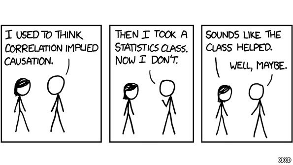 Ett annat kärt ämne för ekonomer är frågan om kausal inferens, alltså om orsak och verkan. Denna strip är ganska träffande för hur vi tänker i dessa termer…