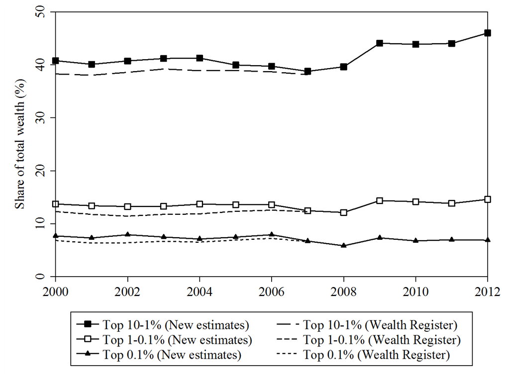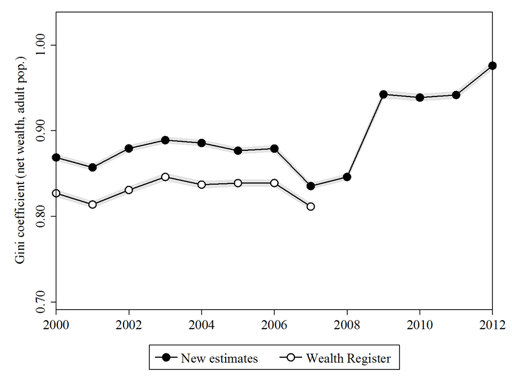 Resultatet gällande Ginikoefficientens utveckling mellan 2000 och 2012 för vuxna individers nettoförmögenheter visas i bilden nedan. Två serier presenteras: en över vår nya beräkning (”Our estimates”) och en över SCBs förmögenhetsregister (”Wealth register”) som fanns t o m 2007. Som synes ligger vår skattade serie hela tiden ca fem procent högre än SCBs serie, vilket antyder att vi missar målet något. Trenden under 2000-2007 är dock densamma i de två serierna. Något händer mellan 2008 och 2009 då vår skattade Gini stiger med över 20 procent, alltså en femtedel, och sedan ligger kvar på den högre nivån. Även om denna ökning också kan vara felmätt, är den så pass markant att den åtminstone överstiger gapet mellan SCBs och vår serie.