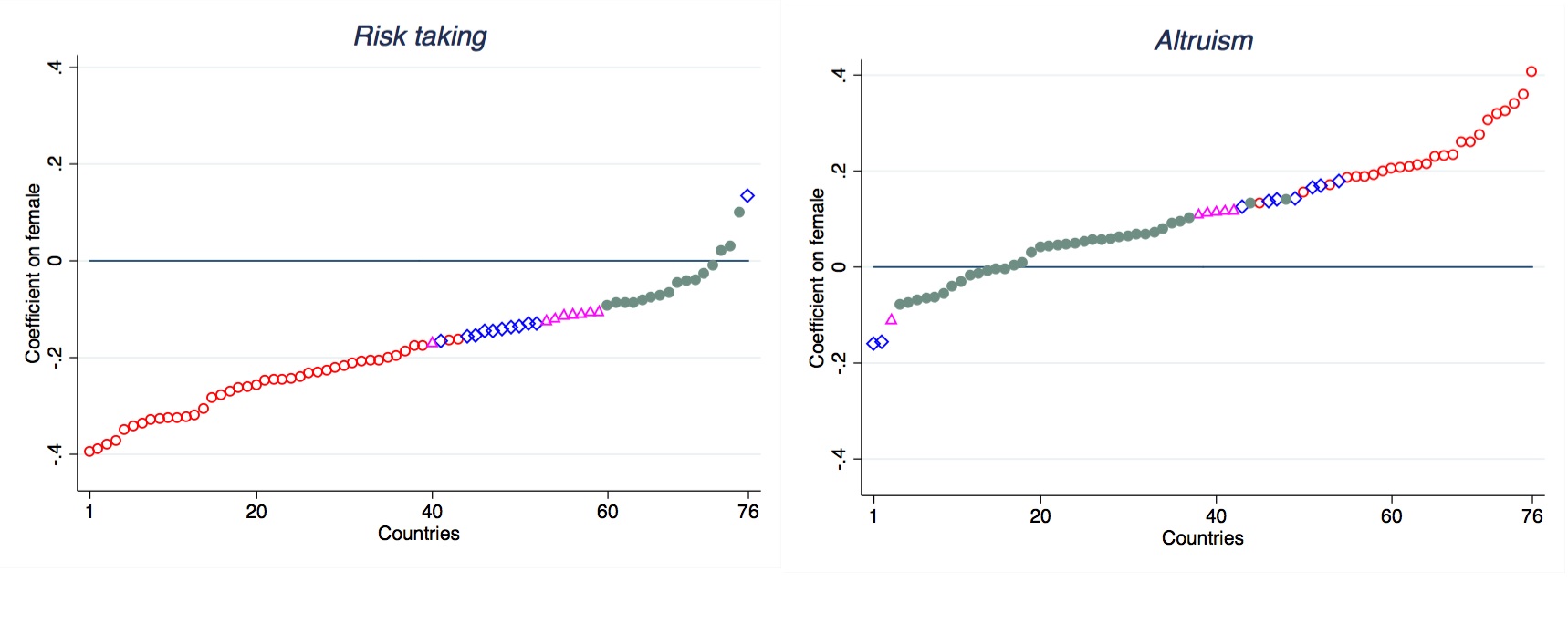 En hel del resultat från den experimentella forskningen bekräftas här i ett betydligt större empiriskt sammanhang. Exempelvis verkar unga och intelligenta personer (mäts med ett enkelt matteprov) vara mer risktagande andra, oavsett var de bor. Att män i genomsnitt är mer villiga att ta risker än kvinnor är också tydligt. Skillnaderna mellan könen — i risktagande och i andra avseenden — varierar dock väsentligt mellan länder, vilket framgår av figuren nedan.
