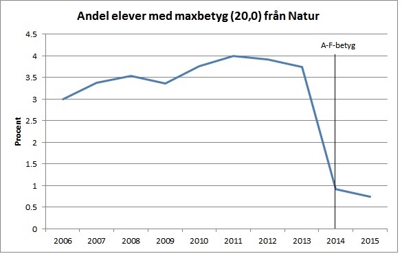 • Att bara lägga skalor på varandra där man inte tar hänsyn till selektionen är naturligtvis fel. Det var därför jag jämförde med studenter på N och inte alla program. Även N-studenterna är positivt selekterade och även på N byter studenter (lite drygt 10%) till andra nationella program efter första året, så det räcker då inte enbart att se till antagningspoängen första året utan man bör kalibrera mellan dem som faktiskt går respektive program. Om vi utgår från att den förra kalibreringen var hyfsat ok så är det emellertid orimligt att inte justera gränserna efter övergången till A-F-betygen. Trots allt föll andelen toppbetygare från N med 80 procent.