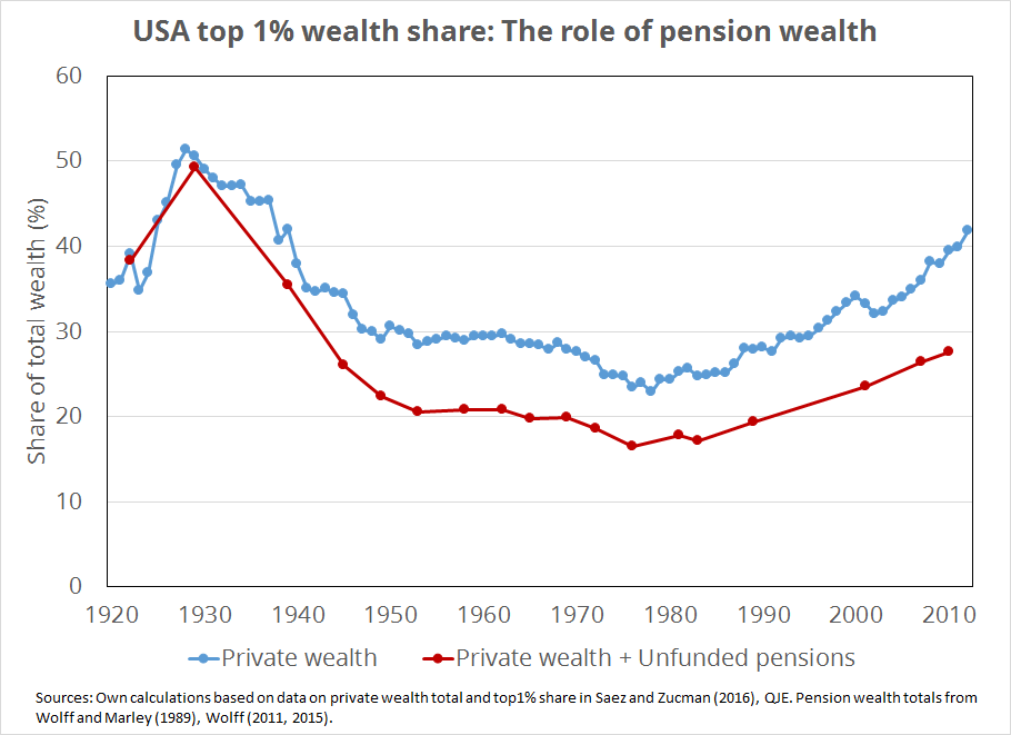 Resultat: Den första bilden visar förmögenhetskoncentrationen i USA mellan 1922 och 2013 för dels nettoförmögenheter (blå linje) och dels nettoförmögenheter inklusive ofonderade pensioners nuvärde (röd linje). Det finns två huvudresultat. Det första är att när man inkluderar nuvärdet av ofonderade pensioner i befolkningens förmögenhet minksar ojämlikheten markant. Istället för en förmögenhetsandel år 2013 på drygt 40% för den rikaste procenten är andelen 27%. Det andra resultatet är att den historiska tidstrenden dock är grovt sett densamma: kraftigt fallande förmögenhetsskillnader under mellankrigstiden, svagt fallande under efterkrigstiden och ökande sedan 1980-talet.