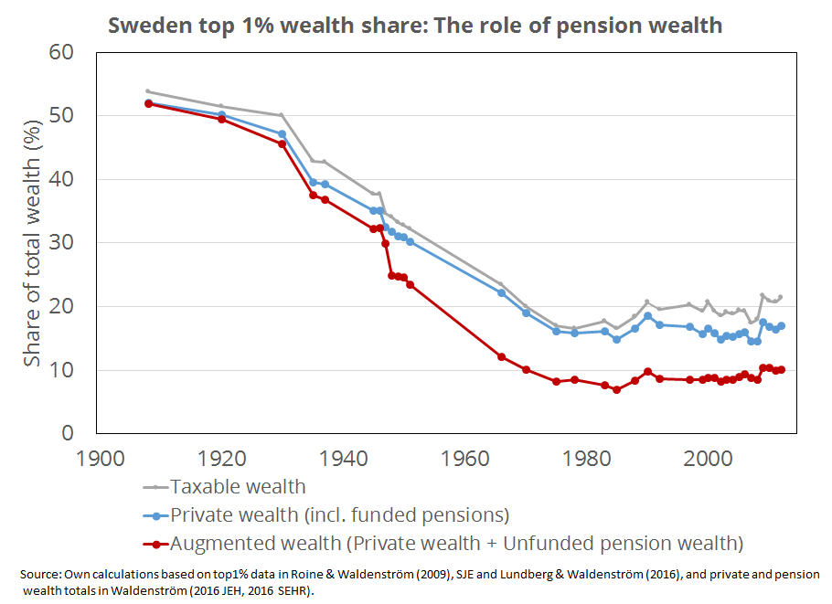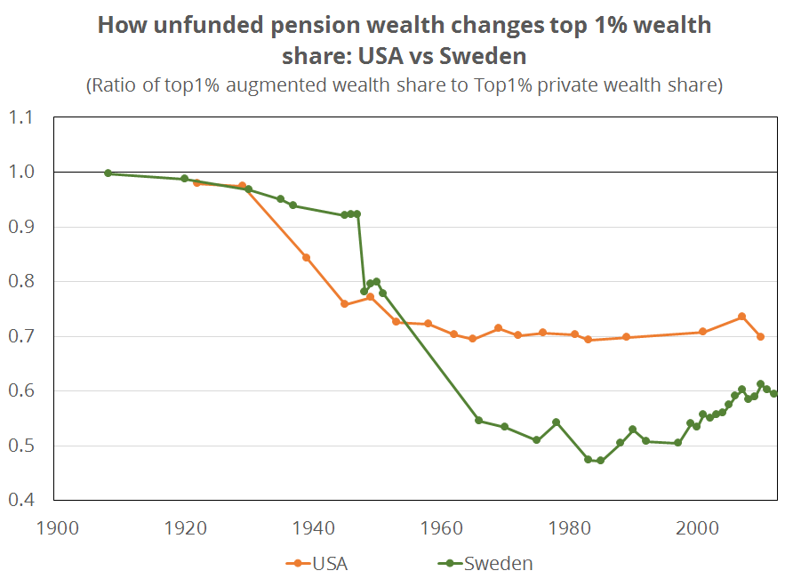För Sverige ser bilden lite annorlunda ut. Den första stora förändringen sker 1948, då folkpensionen reformeras och blir betydligt mer omfattande. Nästa hopp sker under 1960-talet till följd av införandet av det generösa ATP-systemet. Den heltäckande strukturen i Sverige, där de flesta löntagarna har del i systemet, innebär att utjämningen är dubbelt så stor som i USA. Topphundradelens andel halveras när ofonderade pensioner beaktas, även om utjämningseffekten är något mindre sedan 2000-talet då fonderade system spelar en allt större roll.
